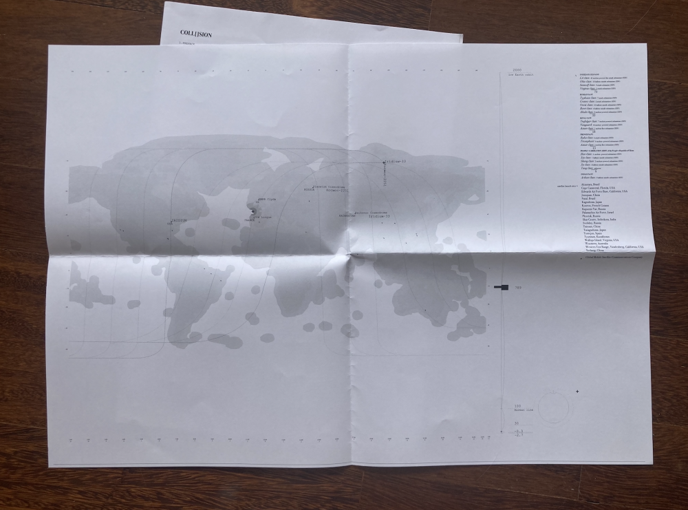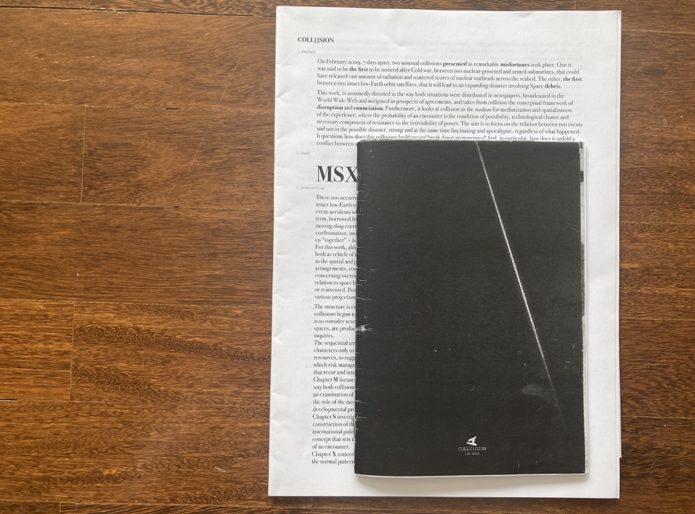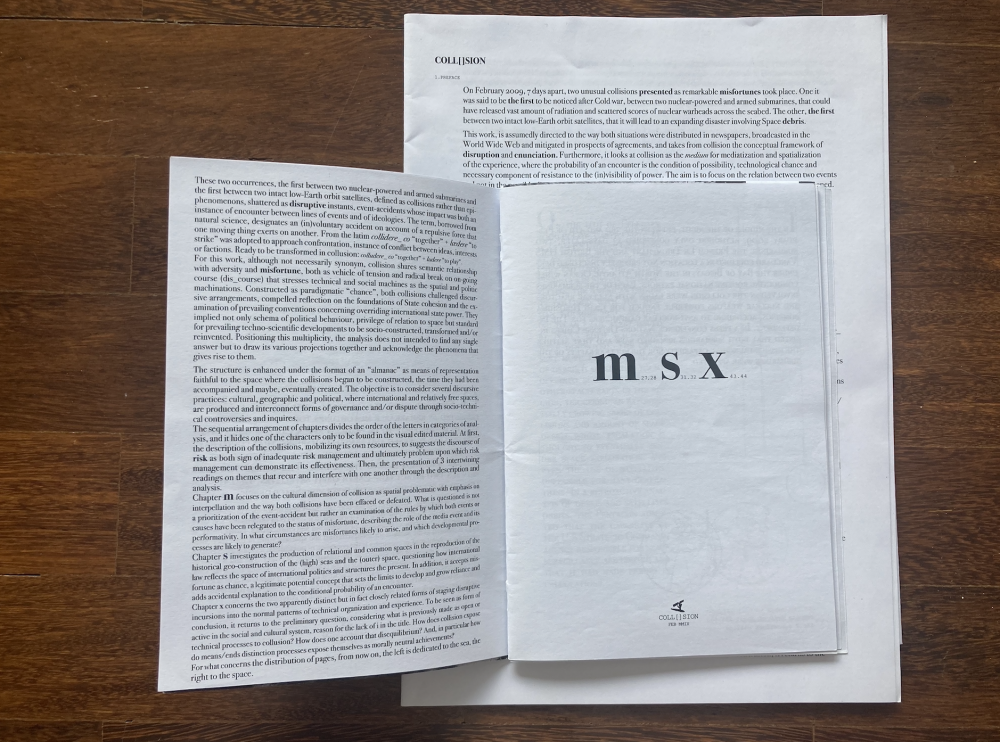 Titled coll[]sion, the zine focuses on the relation between two, seven days interval, event-accidents that happened one in the deep Sea and other in the Outer Space. Both presented as remarkable misfortunes and constructed as paradigmatic changes opened the door to the recognition of failure and to attempts to overcome (or improve) if not to silence and/or deceive. Positioning schemas of military behaviour, the privilege of relation to space and standards for prevailing techno-scientific developments to be socio-constructed, transformed or (re)invented, this work inquires how are international and relatively free spaces produced and by what means they interconnect forms of governance and/or dispute.